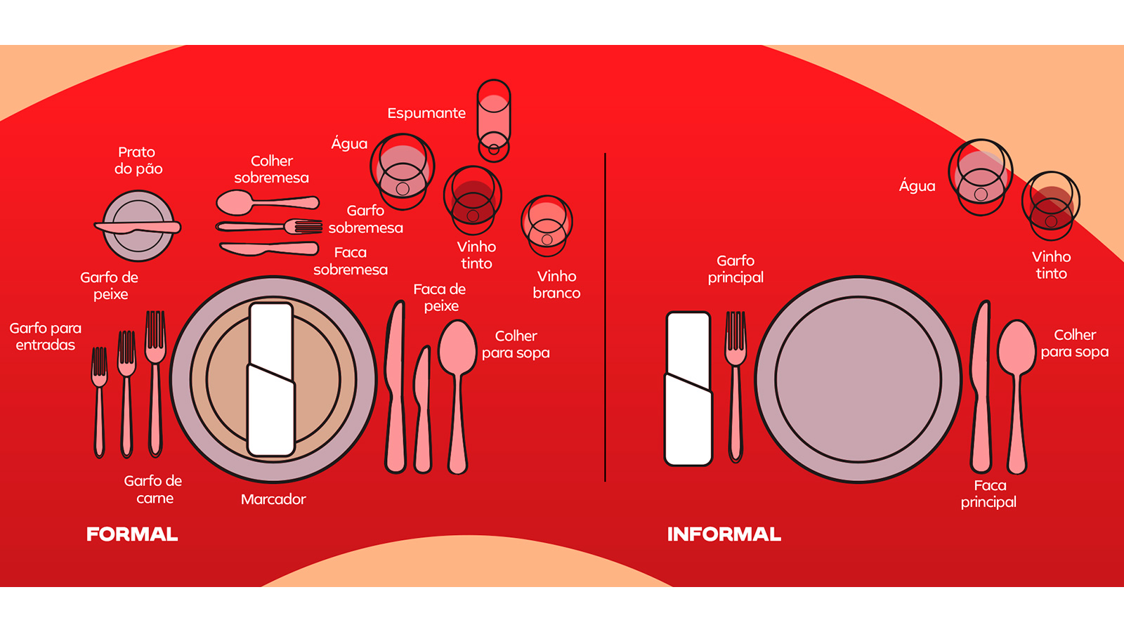 Já uma mesa informal, ideal para refeições casuais com a família ou amigos, é posta de maneira mais simples e prática, com menos utensílios e uma organização mais descontraída. Esta ilustração destaca as principais diferenças entre as duas abordagens, para entender como ajustar a mesa em sua casa conforme a ocasião.