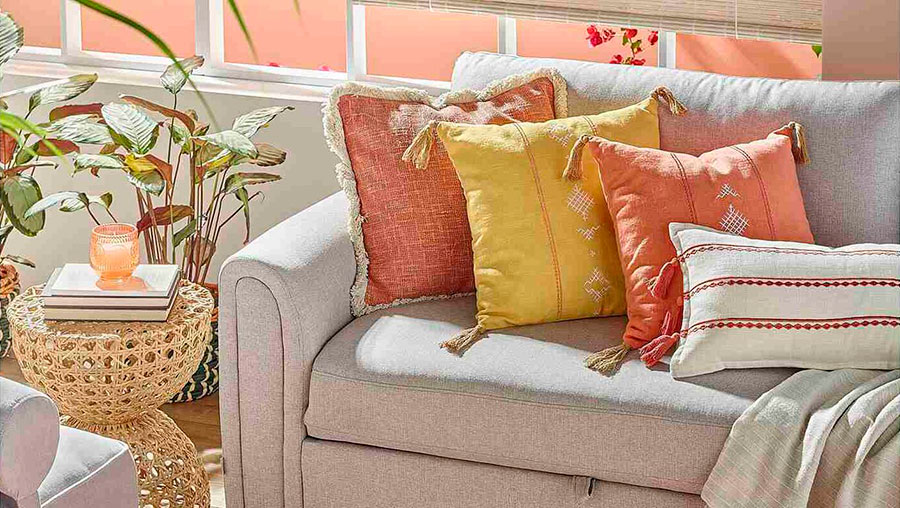 - Comece pelos essenciais, como um sofá confortável e almofadas em diversas cores e texturas.