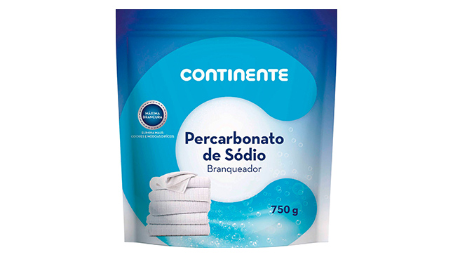 No Continente encontra percarbonato de sódio numa embalagem de 750 g, indicado para roupas brancas ou de cores claras. Só precisa de misturar com um pouco de água até obter uma pasta, aplicar diretamente sobre as nódoas e deixar atuar antes de ir à máquina.