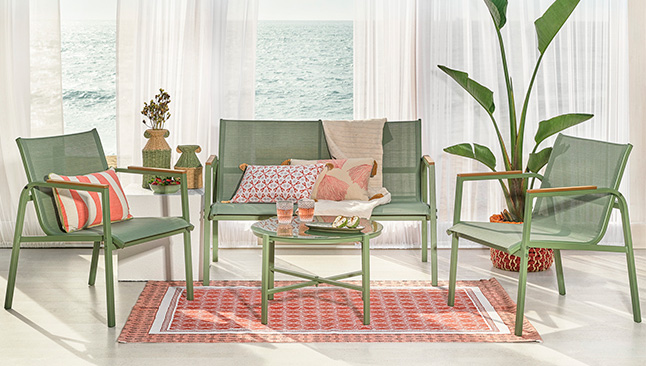 Os conjuntos de estar vão definir a área para relaxar e conviver. Tal como os conjuntos de refeição, este tipo de mobiliário de jardim existe em diversos materiais (wicker, alumínio, madeira, etc.) e dimensões (para duas, 4, 6, 8 ou mais pessoas).