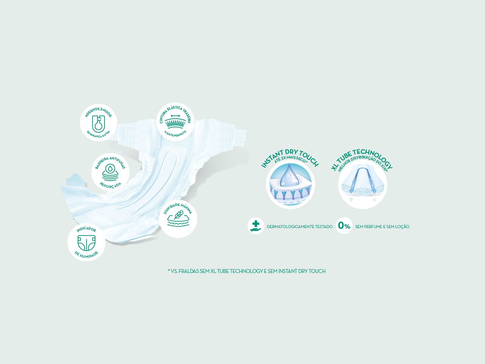 As nossas fraldas têm uma tecnologia que deixa o rabinho do seu bebé até duas vezes mais seco, e com uma melhor distribuição do xixi para uma absorção rápida e eficaz, protegendo-o por mais tempo.