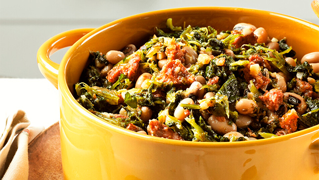 O Polvo à Lagareiro — com batatas, cebolinhas e grelos salteados — é uma das sugestões imperdíveis do chef André para o almoço da Páscoa. Ao servir, regue com um generoso fio de azeite virgem extra aromatizado com alho fresco picado e finalize com salsa picada para realçar os sabores.