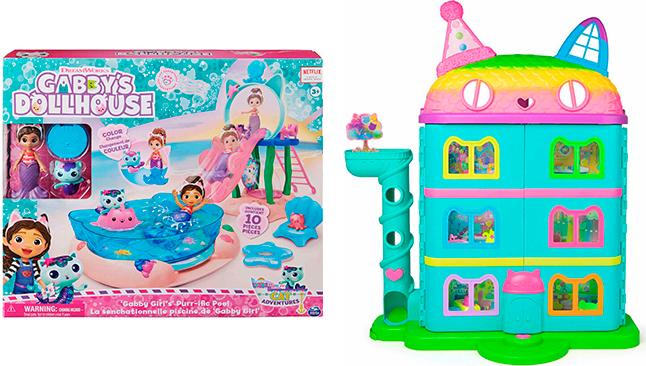 - Piscina Gabby's Dollhouse: inclui uma piscina com escorrega, figuras, acessórios e caudas de sereia que mudam de cor com água morna para criar momentos mágicos durante as brincadeiras.
