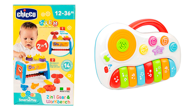 - O Meu 1º Teclado - Happy Bear: este teclado colorido permite explorar sons e melodias, com teclas musicais e botões de animais que estimulam as capacidades visuais e auditivas.