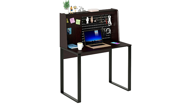 Esta secretária de escritório com um design minimalista tem uma parede frontal com uma pequena prateleira, ganchos para pendurar acessórios e um recipiente para guardar lápis, canetas ou até marcadores para sublinhar.