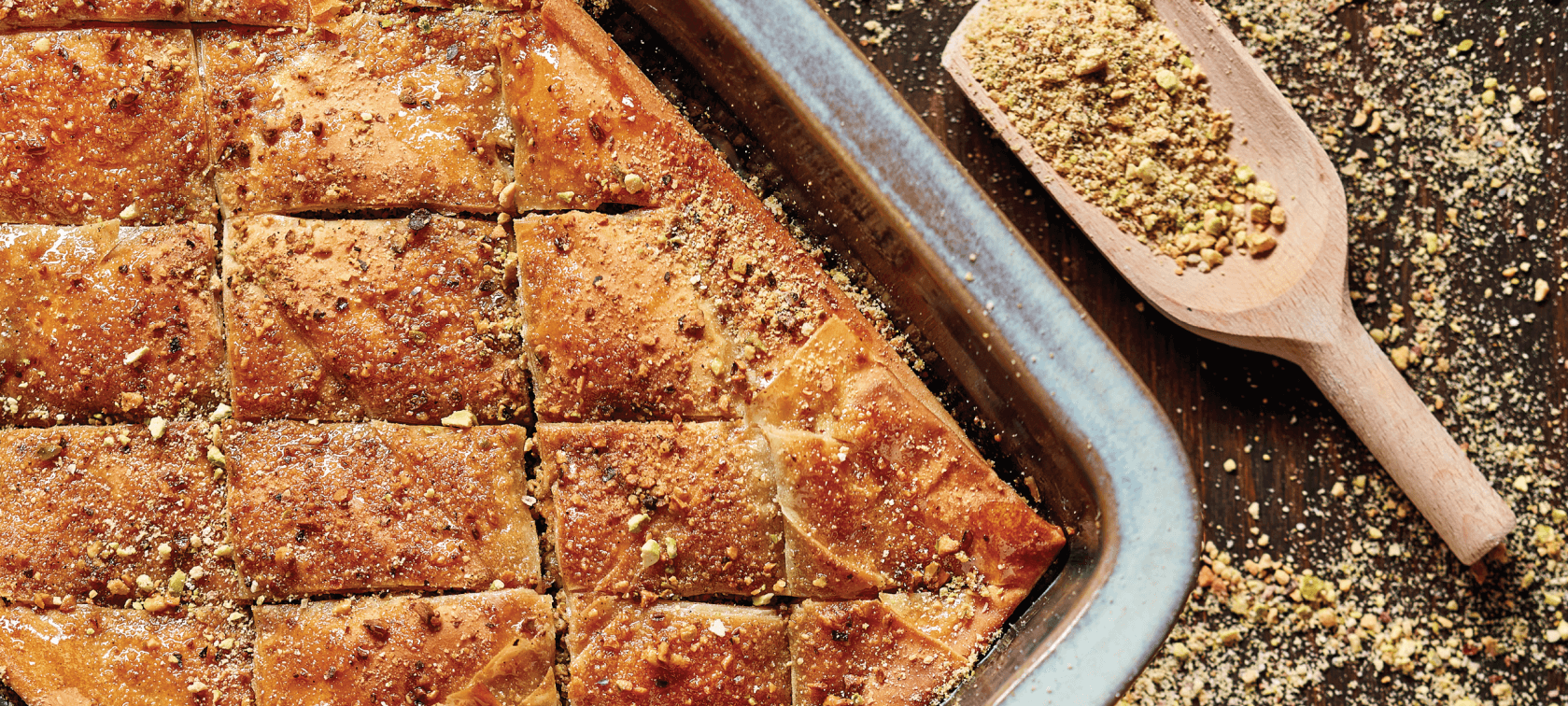 Feita com folhas de massa filo cortadas em losangos ou quadrados, e tradicionalmente recheada com pistácios ou nozes trituradas, cobertas por uma calda aromatizada com especiarias como a canela. A Baklava não só possui um aspeto inconfundível, como também um sabor irresistível.
