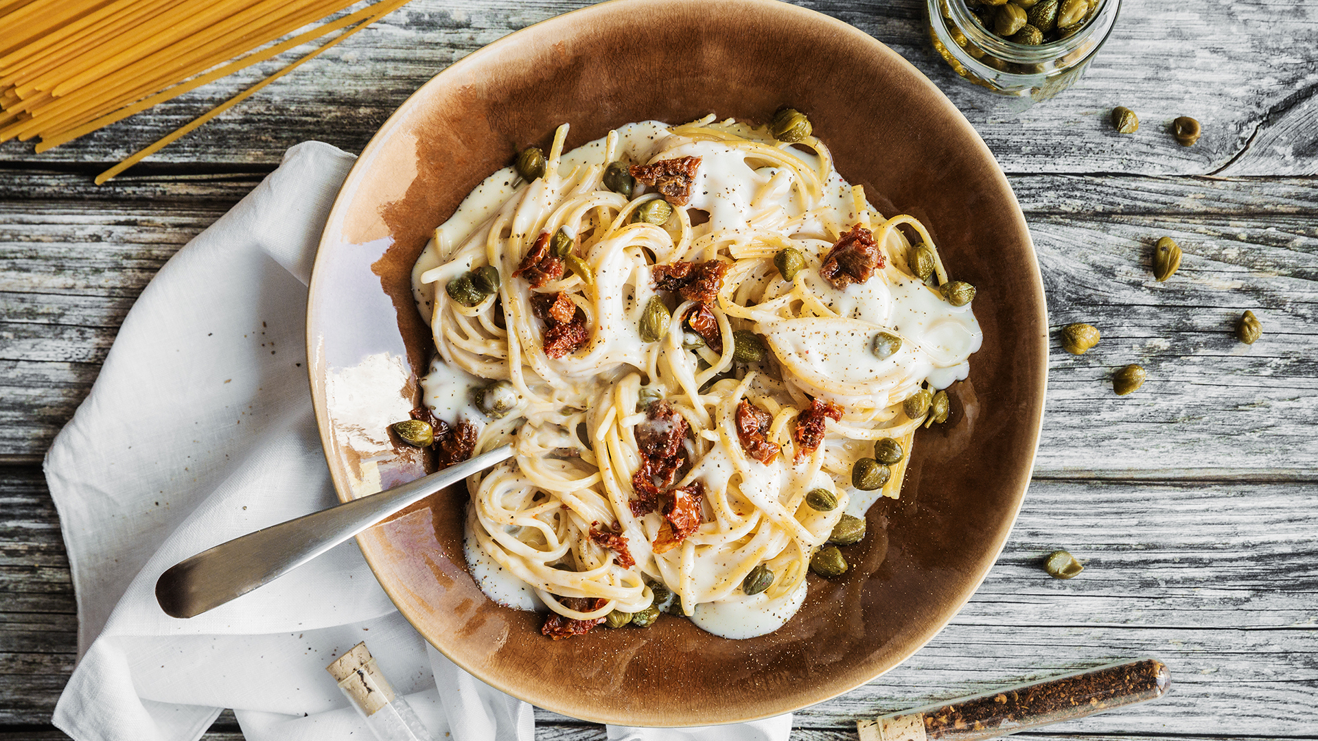 Numa frigideira com um fio de azeite, salteie o tomate durante 3 minutos. Sem retirar do lume, junte a massa e as amêndoas.