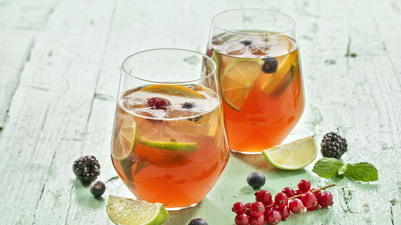 Transfira a mistura para um jarro e adicione o champanhe (ou espumante), gelo picado a gosto e folhas de hortelã.