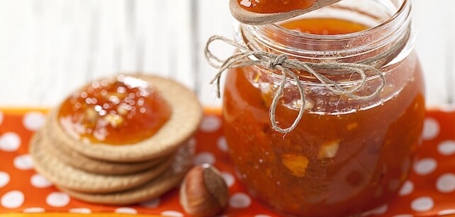 Coloque a abóbora em frascos, intercalando com as avelãs e por fim cubra com o xarope até os frascos ficarem cheios. Feche-os com a tampa de rosca e vire-os ao contrário até arrefecerem.