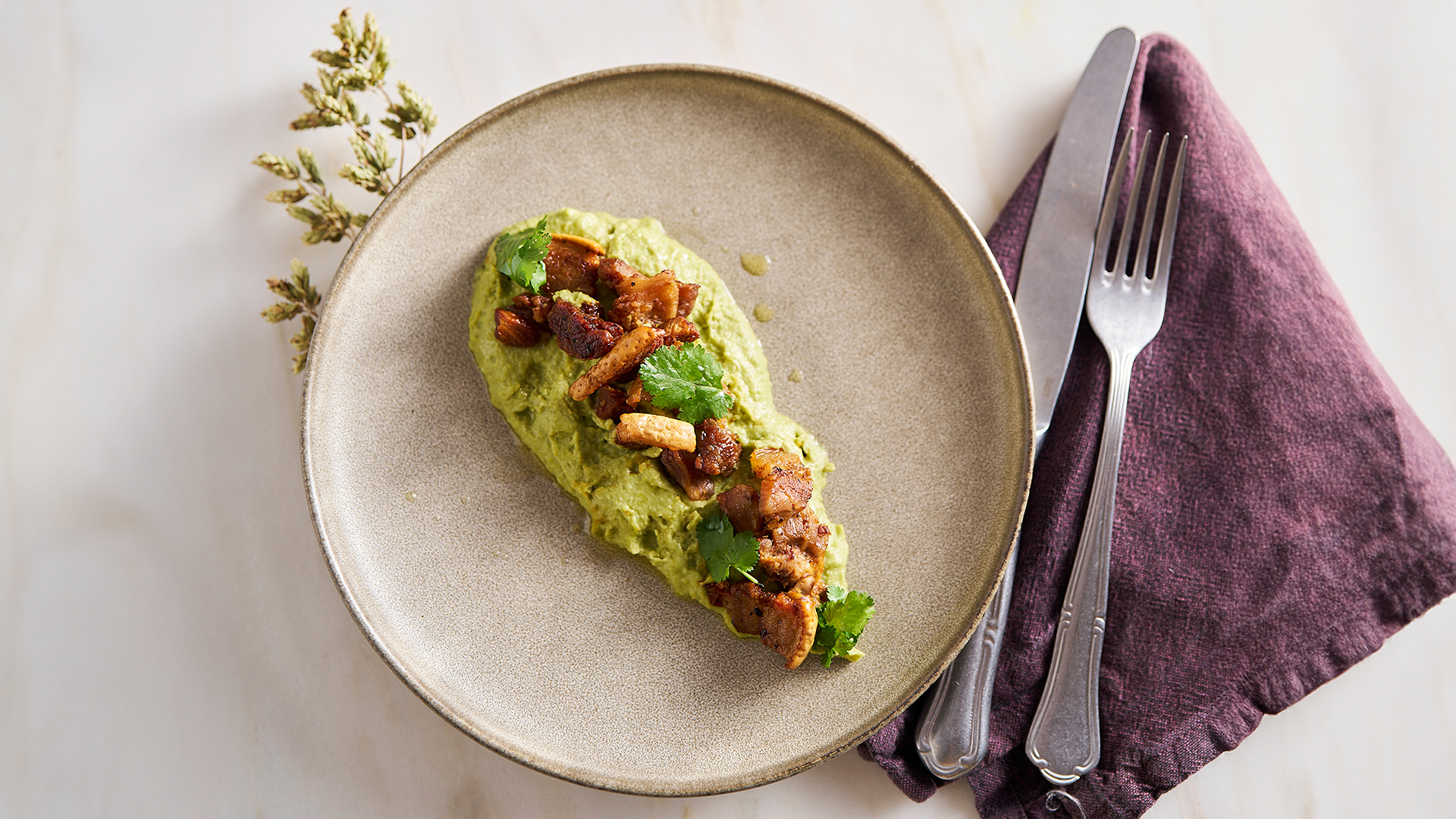 Temperar as costeletas de vitela com sal grosso dos dois lados, mariná-las no chimichurri e colocar a carne na grelha. Entretanto, esmagar as batatas (já cozidas) e colocá-las na grelha, quando estiverem douradas pincelar com um pouco da marinada de chimichurri.