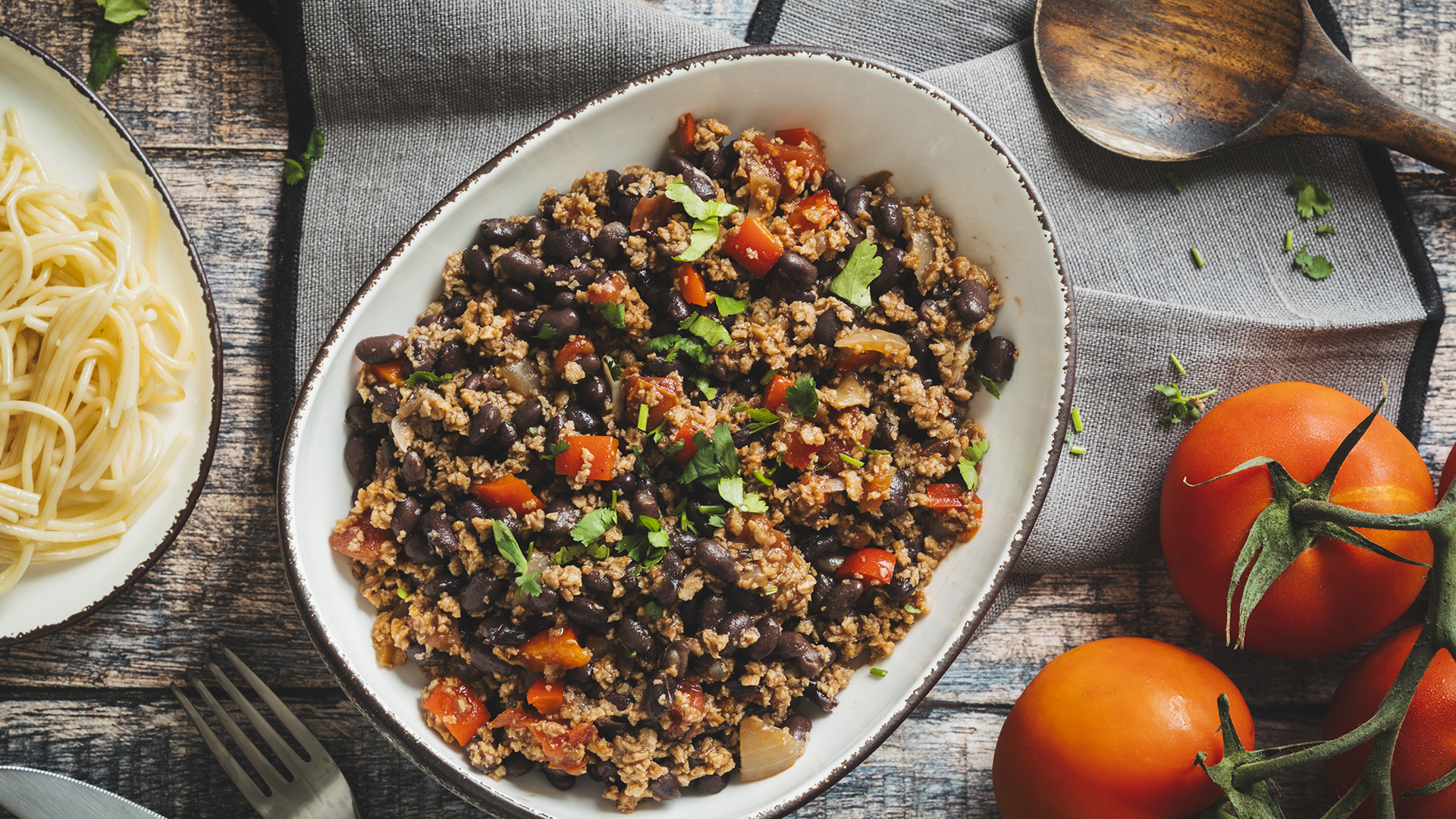 Num tacho, coloque um pouco de azeite e adicione os alhos e a cebola picada. Junte a soja escorrida, a polpa de tomate e tempere a gosto. Deixe cozinhar alguns minutos.
