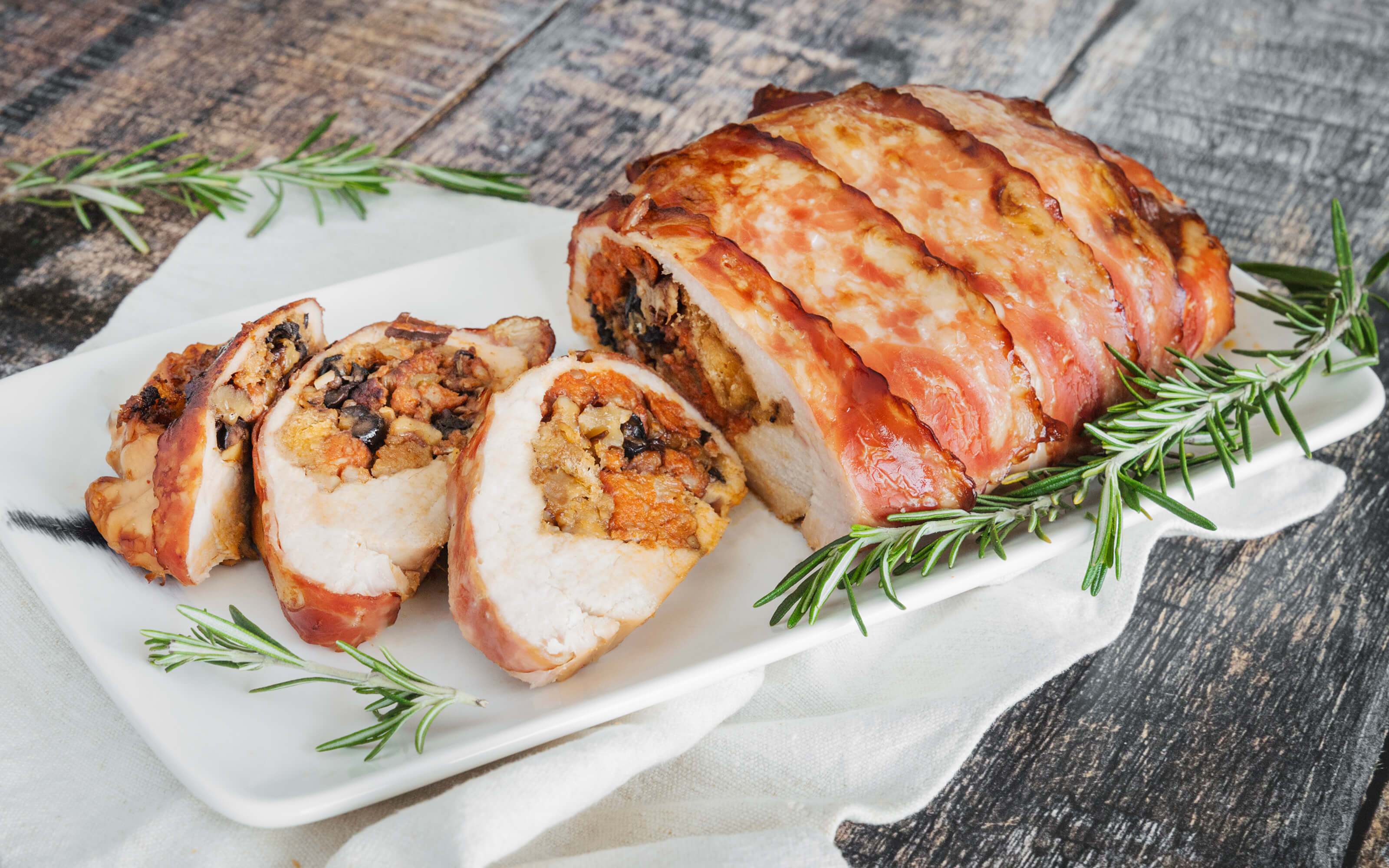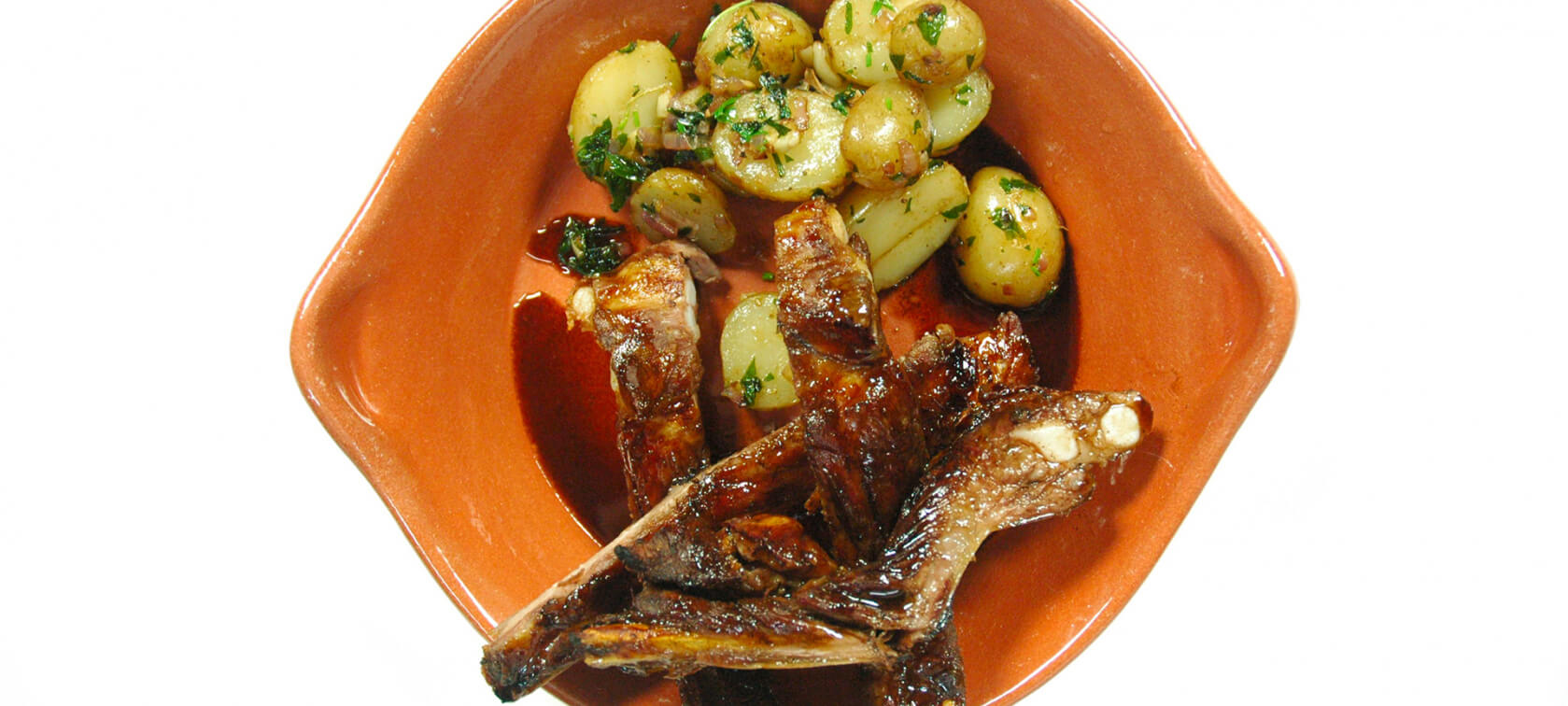 Adicione mais um pouco de azeite, junte o louro e refogue a cebola picada e os dentes de alho picados. Acrescente o bacon picado, refresque com o vinho e raspe o fundo da frigideira.