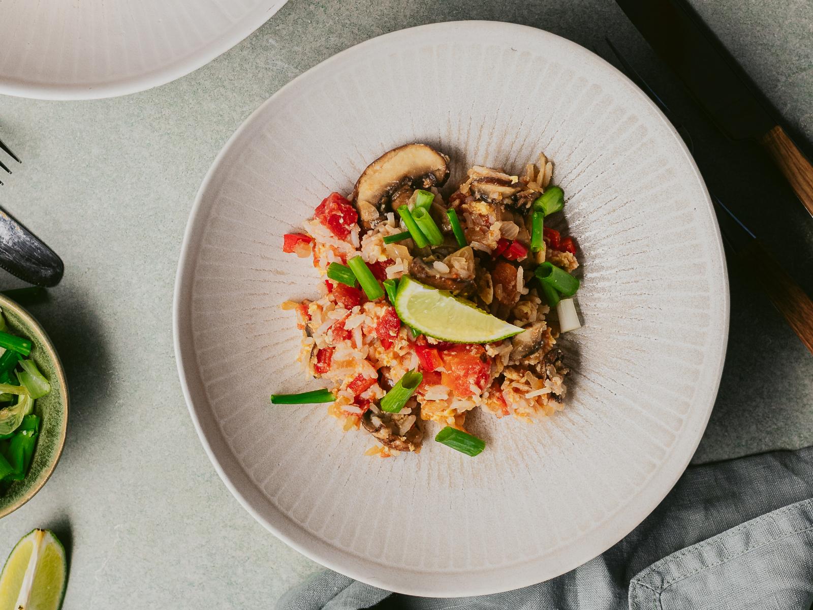Sirva o khao pad e decore com cebolinha fresca e gomos de lima.