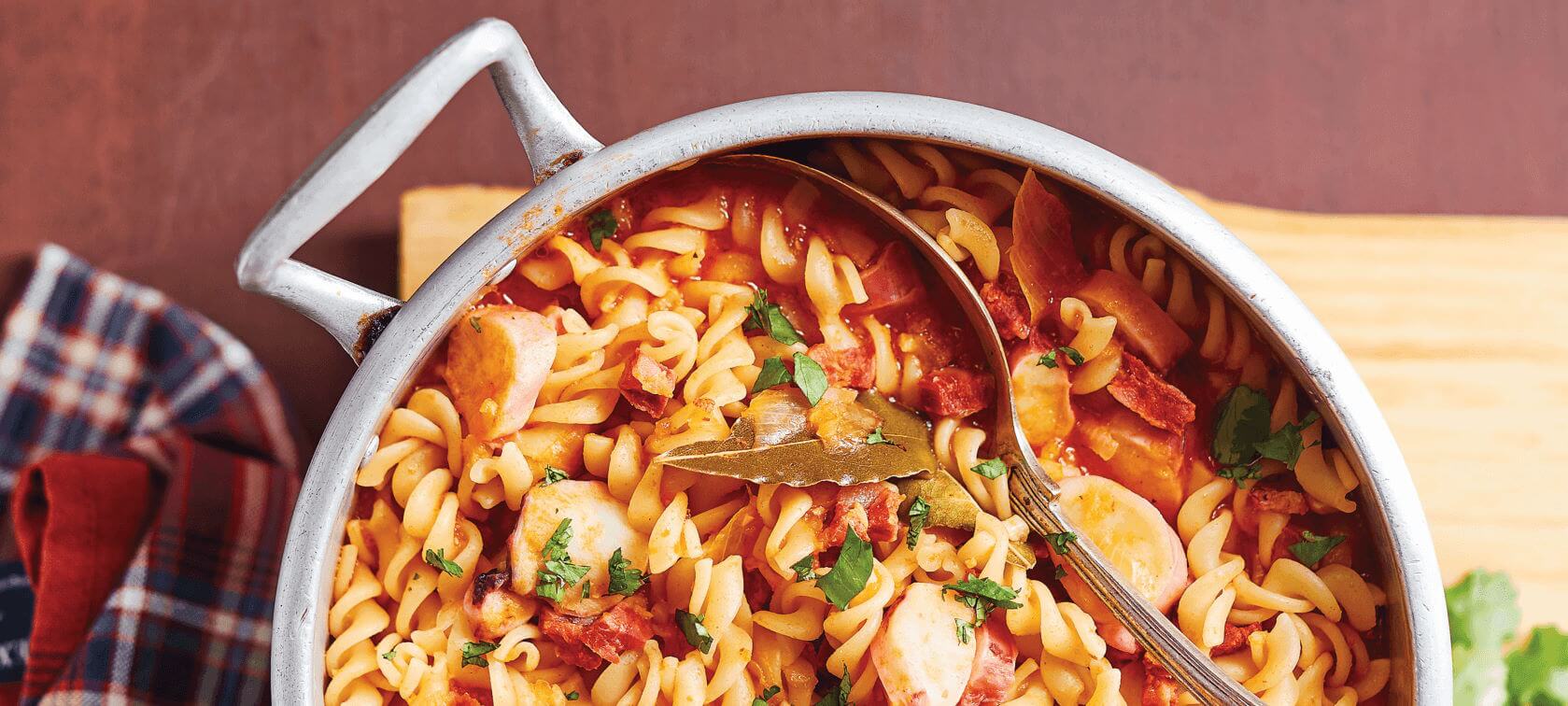 Junte o vinho branco e o caldo de peixe, deixe levantar fervura e insira a massa.