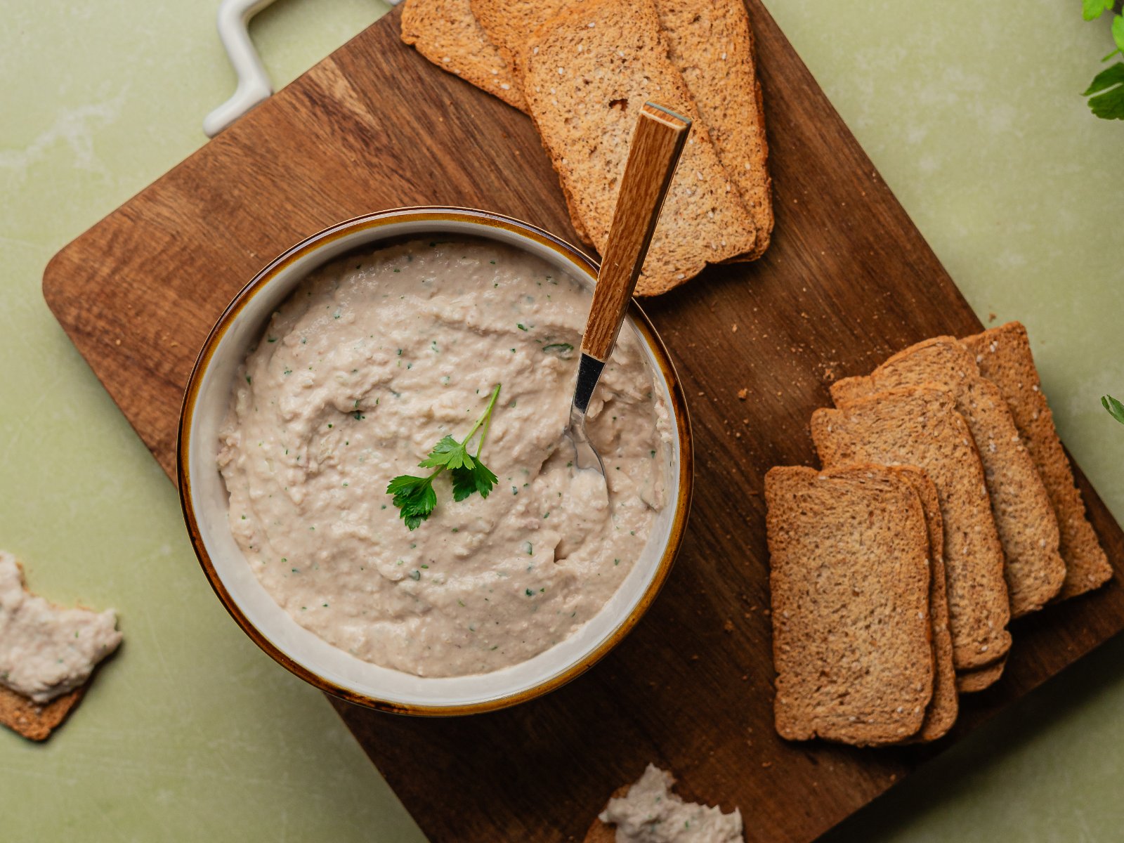 Disponha numa taça o paté de atum, decore com salsa e acompanhe com tostas.
