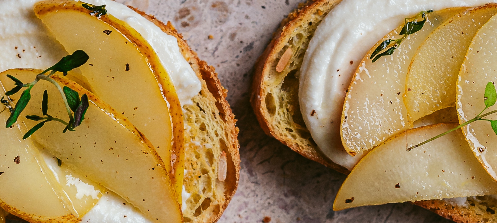 Barre as fatias de pão torrado com a mistura de ricotta, disponha as peras caramelizadas por cima e decore com tomilho e pimenta a gosto.