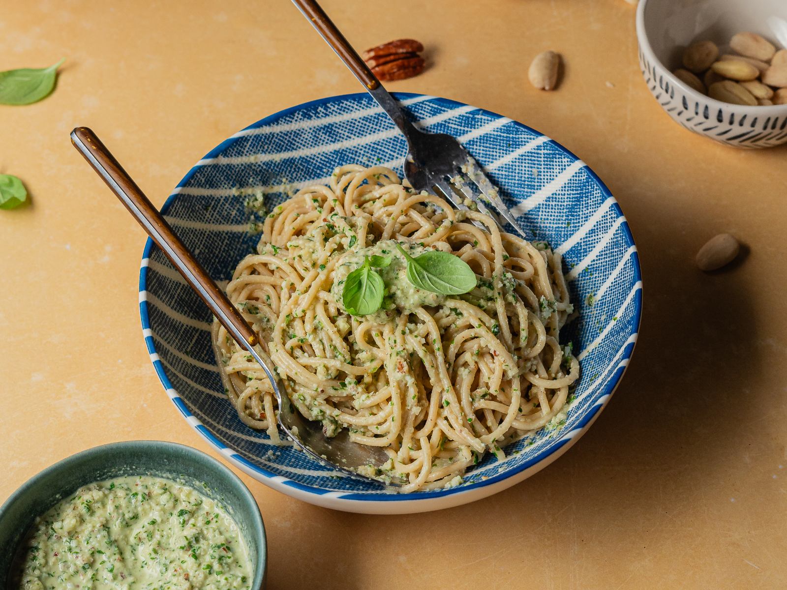 Aqueça uma frigideira em lume médio, coloque 1 a 2 colheres de sopa de pesto deixe aquecer um pouco e parta os ovos por cima do pesto. Tape com o testo e deixe cozer até cozedura do ovo desejada.