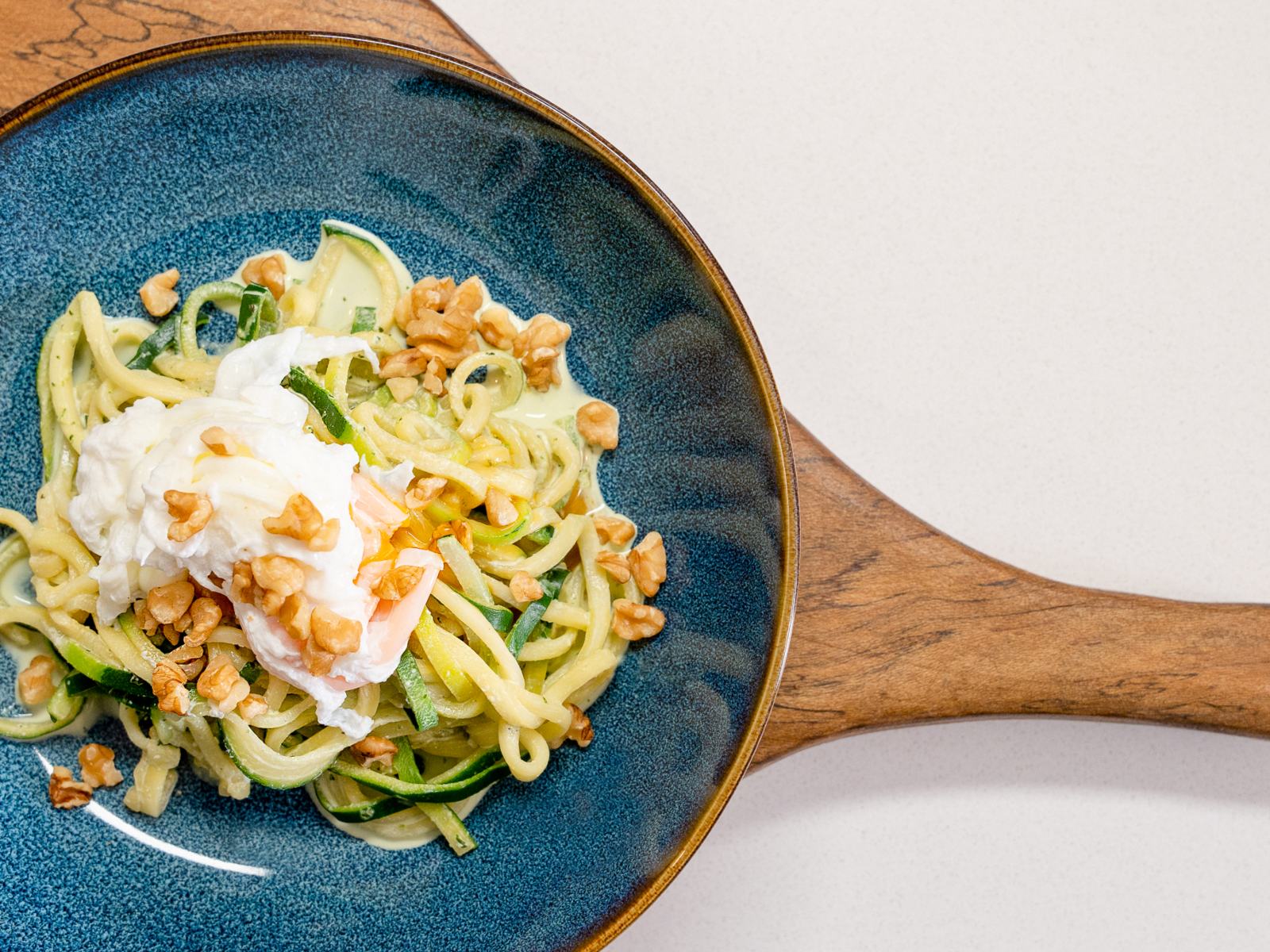 Retire do forno e coloque as fatias de presunto e polvilhe com as folhas de rúcula. Regue com um fio de azeite e um fio de creme balsâmico.