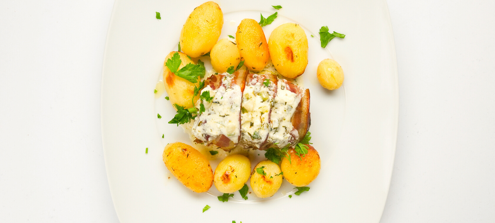 Sirva os palitos de batata assada e por cima a posta Mirandesa. Regue com o molho de alho e decore com alecrim.