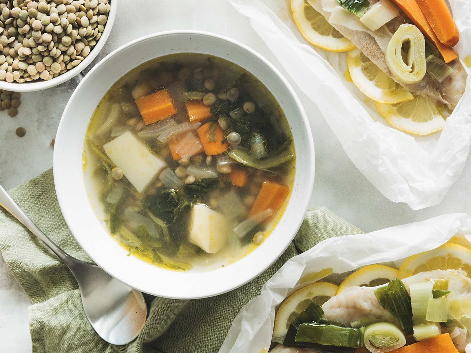 Junte a cebola e os alhos laminados, as folhas de louro, a massa de pimentão, regue com sumo de limão e um fio de azeite e tempere com pimenta. Envolva bem, tape com papel de alumínio e leve ao forno a 200ºC por 30 minutos.