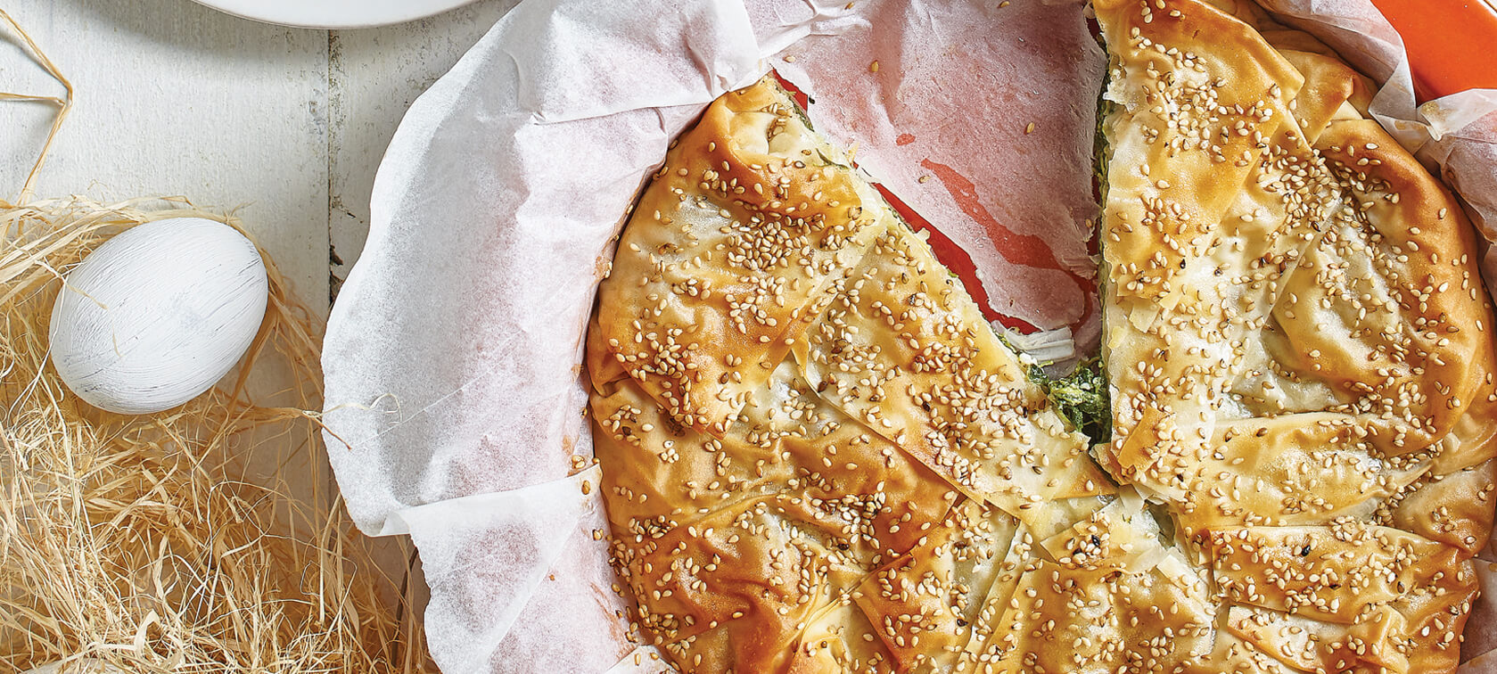 Verta o recheio sobre a base da quiche. Pressione as folhas de espinafre no recheio, deixando um pouco a sair de cima.