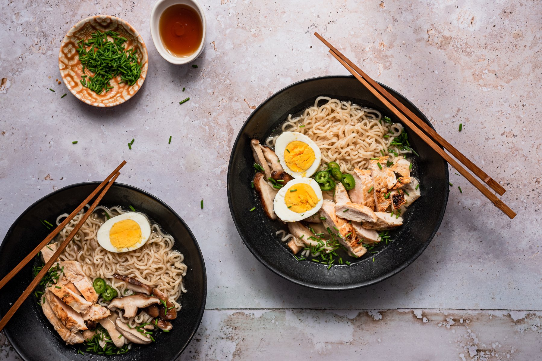 Sirva o ramen em taça fundas, disponha 1 ovo cozido cortado ao meio, rabanete às rodelas finas e decore com cebolinho picado.