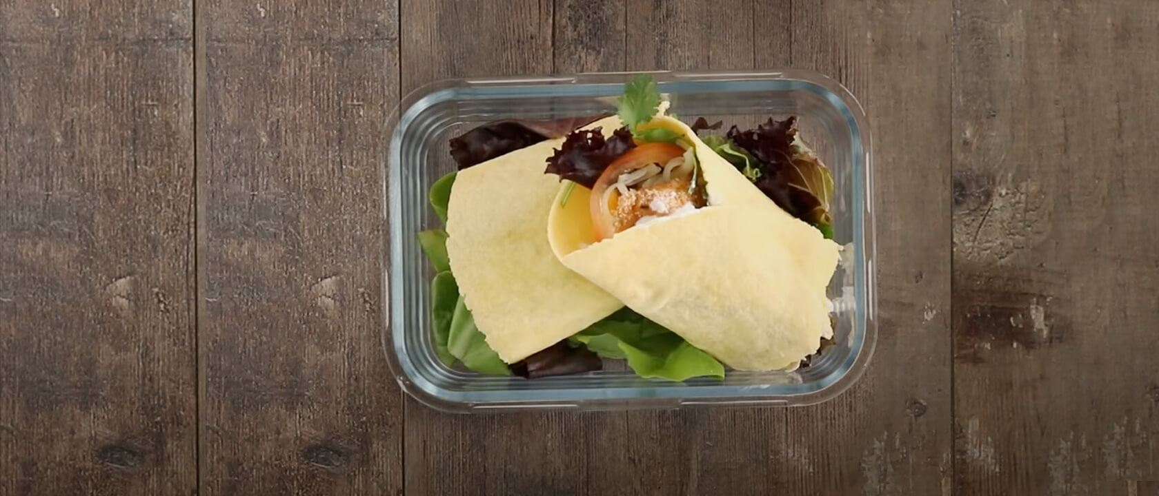 3. Coloque a mistura de alfaces e o grão no fundo da marmita e envolva.