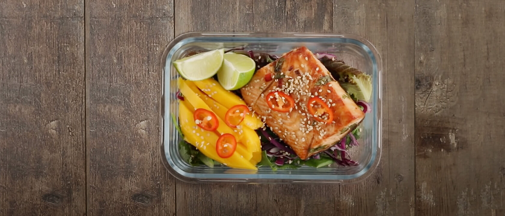 5. Coloque a mistura de alfaces no fundo da marmita e por cima a manga, a couve roxa e o salmão. Regue com o molho restante no papel vegetal e junte os gomos de lima.