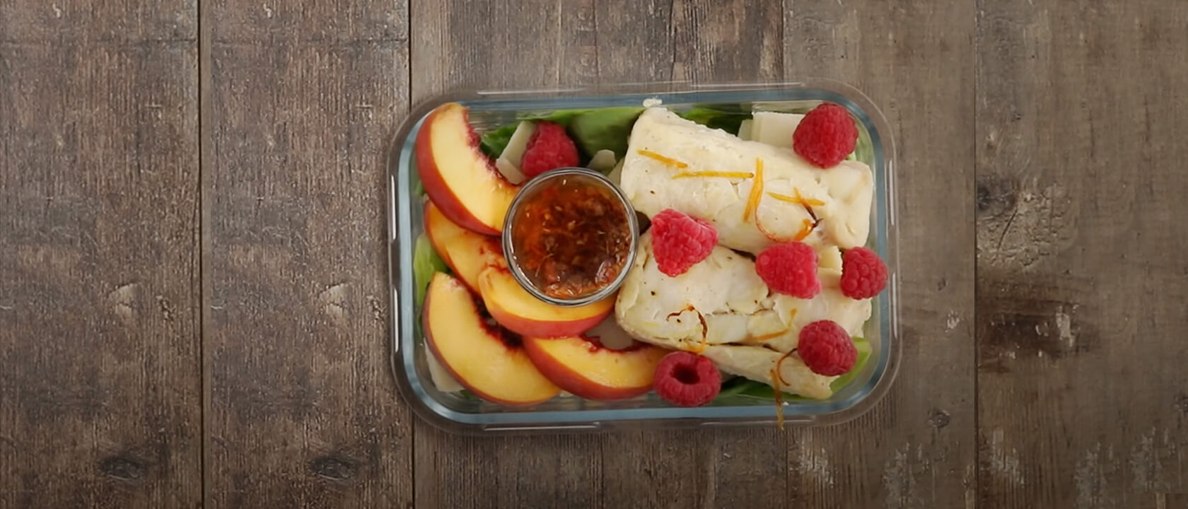 5. Disponha o queijo parmesão por cima, os gomos de pêssego, a pescada e as framboesas e junte uma taça com o molho.