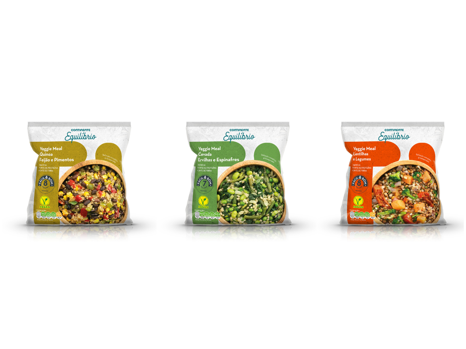 As refeições vegetarianas Veggie Meal estão disponíveis no Continente Online e nas lojas físicas, em 3 combinações de sabores: lentilhas e legumes, quinoa, feijão e pimentos e cevada, ervilhas e espinafres.