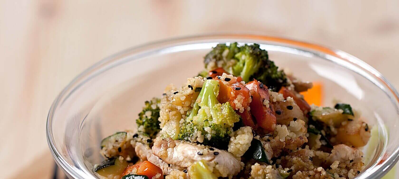 Coloque numa frigideira grande o cuscuz com quinoa e salteie com as três colheres de sopa de azeite cerca de 3 minutos. Em seguida junte a água e salteie mais 3 minutos. Retire e deixe arrefecer. Tempere com coentros picados a gosto.