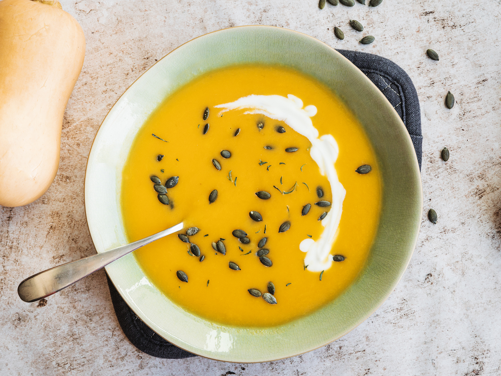 Retire e sirva a sopa em pratos fundos. Decore com um fio de natas, nozes picadas, orégãos frescos e pimenta preta.