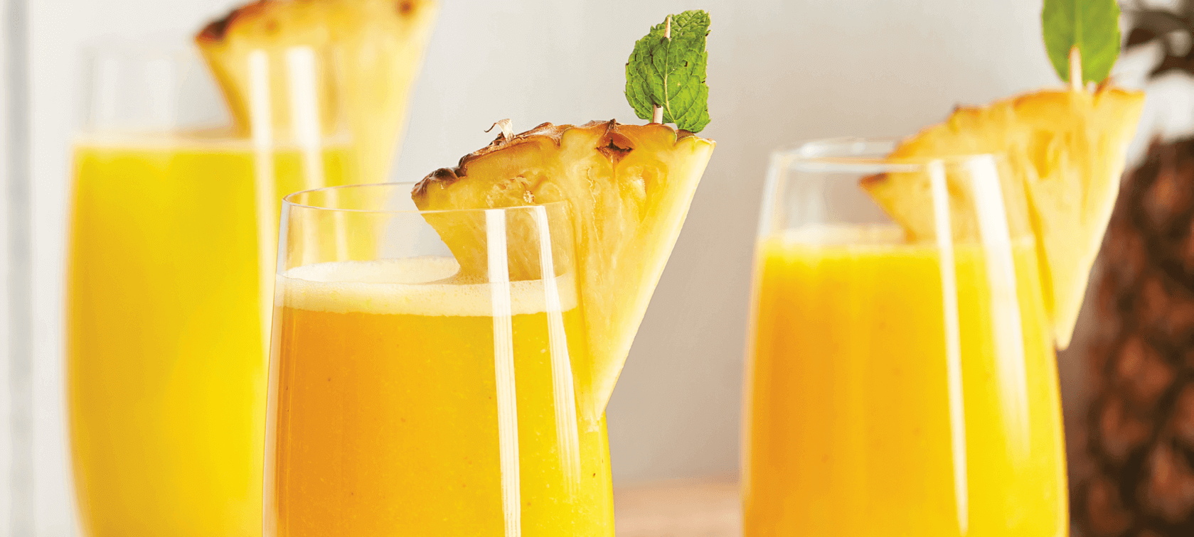 Num liquidificador, coloque as rodelas de abacaxi, o sumo de laranja, as bananas, a água e hortelã.
