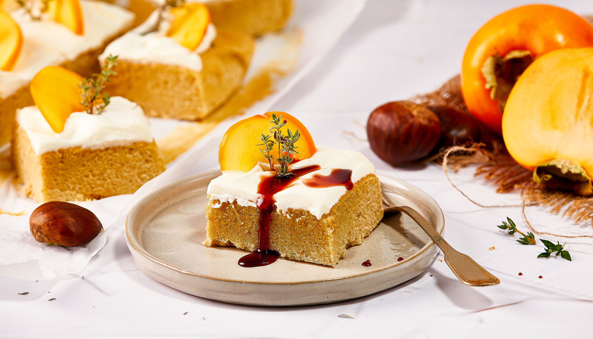 Numa tacinha̩ misture o mascarpone com o açúcar e distribua por toda a superfície do bolo arrefecido. Decore com fatias de dióspiro e tomilho e regue com a calda de vinho do Porto.