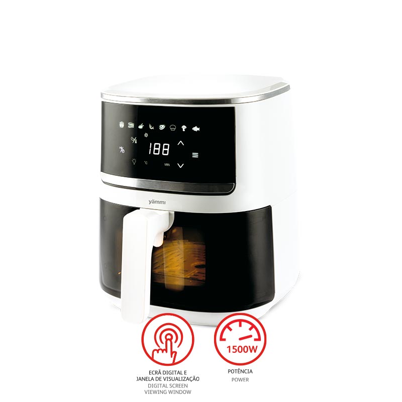 Com 4,3L de capacidade e tecnologia de ar quente envolve os alimentos e cozinha-os sem gordura e em menos tempo.