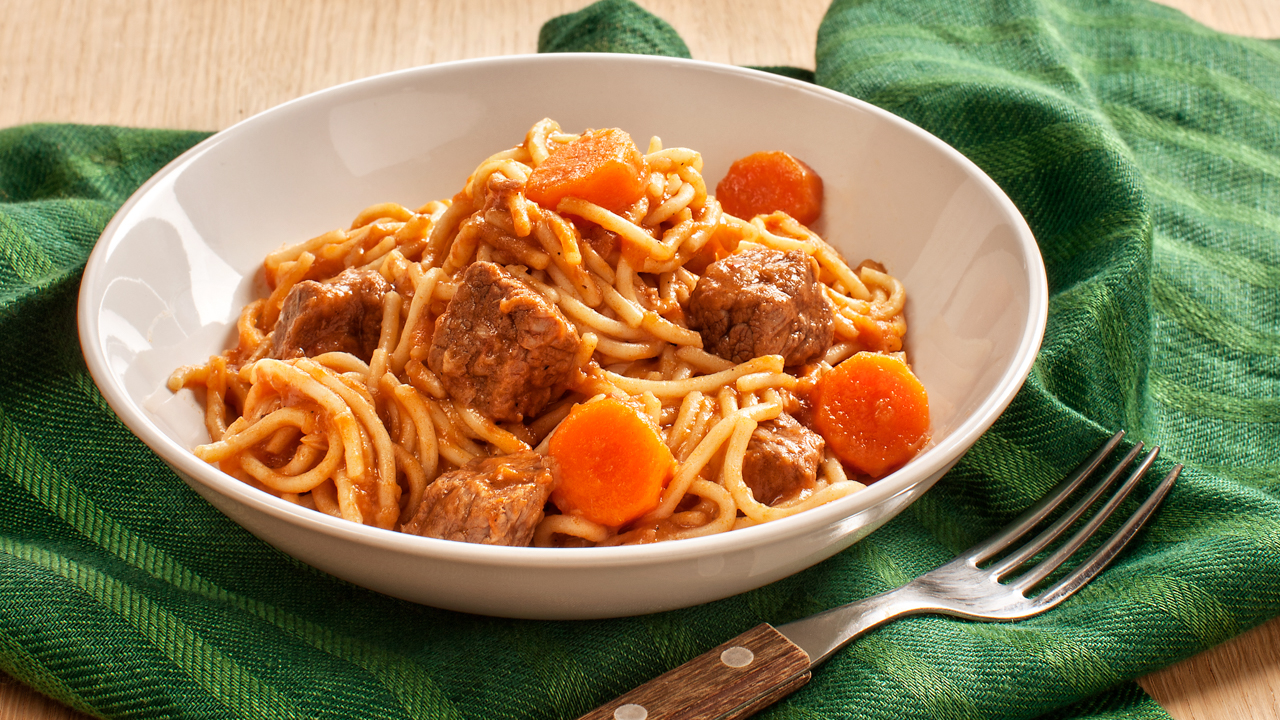 Adicione a carne, a cenoura cortada às rodelas, o caldo de carne, a polpa de tomate, o vinho, sal e pimenta a gosto e a folha de louro e programe 7 minutos, a 100 °C, Rotação Inversa na velocidade 2.