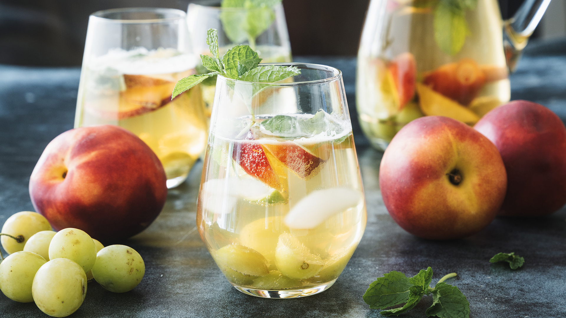 Junte o gelo no jarro, envolva coma espátula e sirva de imediato, decorando cada copo com 1 folha de hortelã.