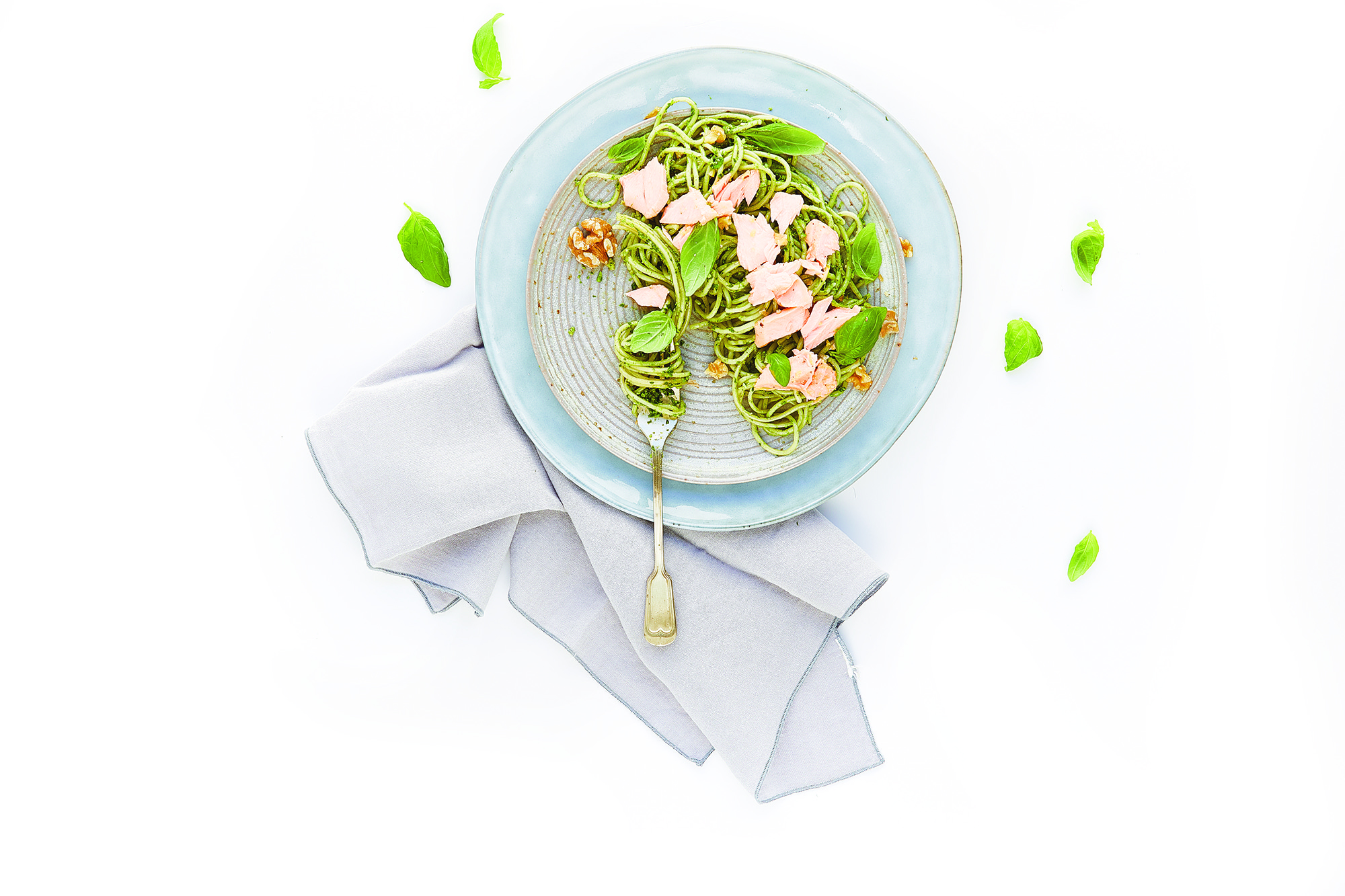 Envolva o esparguete no pesto e sirva com o salmão, os espinafres, o funcho e a cebola em fatias finas.