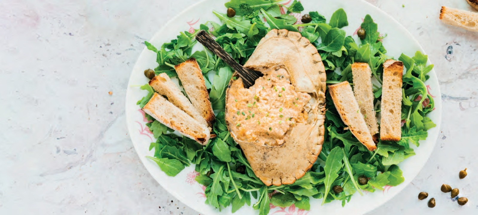Sirva sobre uma cama de rúcula e com tostas de pão torrado a acompanhar.