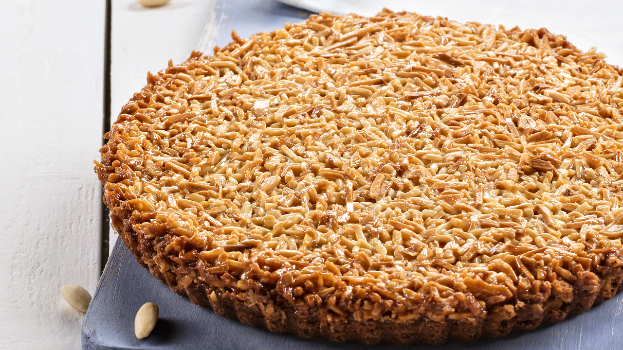 Espalhe a cobertura de amêndoa por cima e leve ao forno (a 190 °C) durante 25‑30 minutos aproximadamente. Retire‑a do forno quando estiver dourada à superfície.
