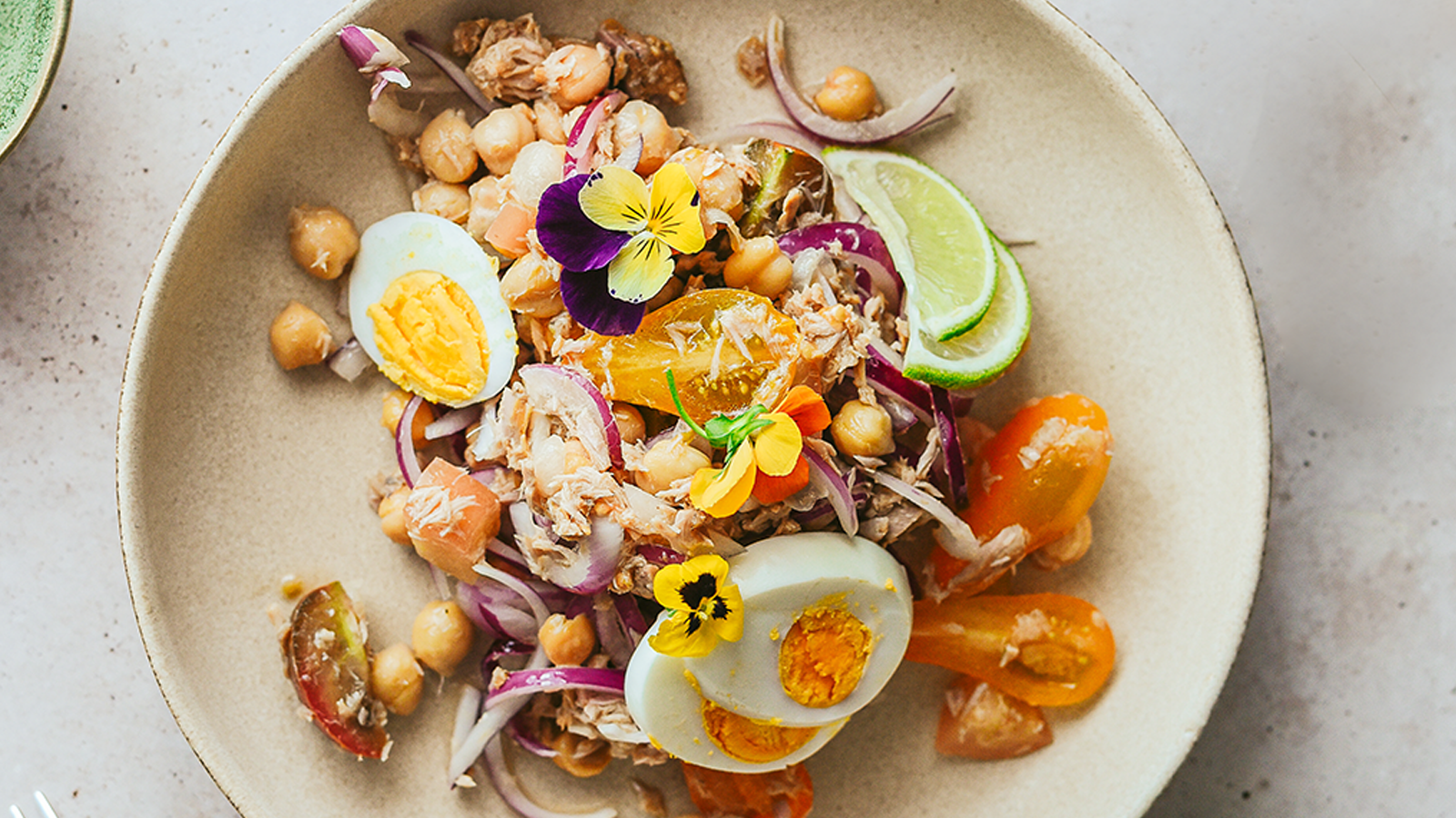 Salada de grão, tomate e atum
